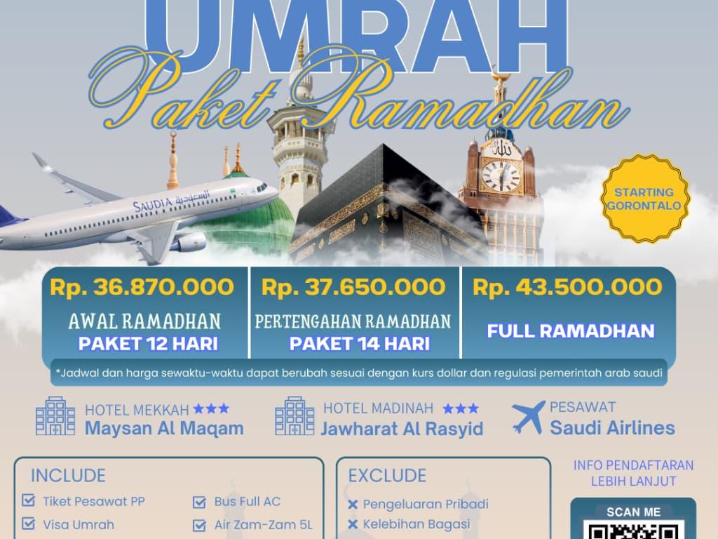 - Perlengkapan : Koper kabin, koper bagasi, tas paspor, kain ihram/mukena, sandal, buku manasik, kain seragam, syal, & sabuk