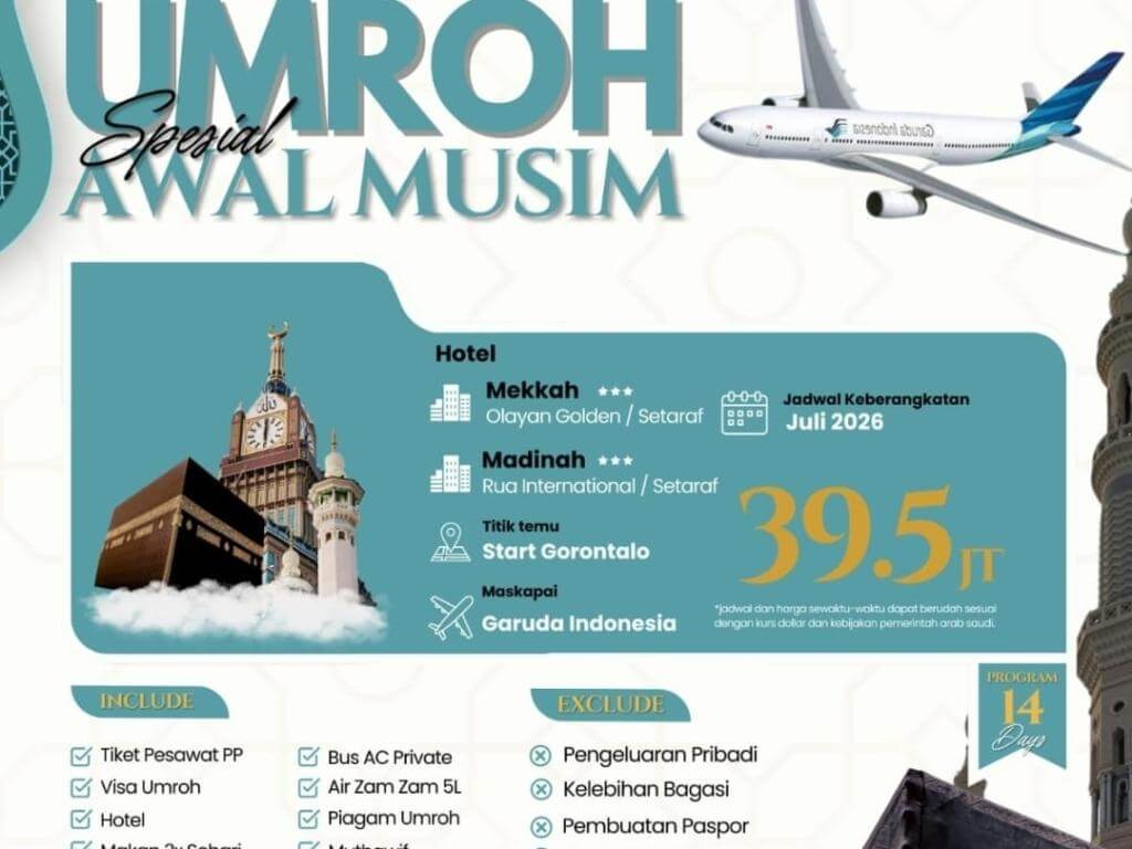 - Harga tidak termasuk pengurusan paspor, vaksin meningitis & polio, surat mahram, kelebihan bagasi, dan pengeluaran pribadi lainnya.